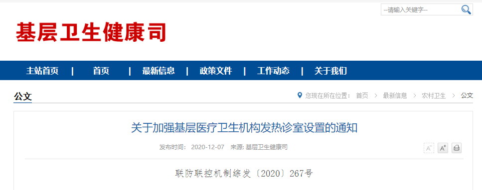隨后,12月7日國家衛(wèi)生健康委下達(dá)《關(guān)于加強(qiáng)基層醫(yī)療衛(wèi)生機(jī)構(gòu)發(fā)熱診室設(shè)置的通知》。