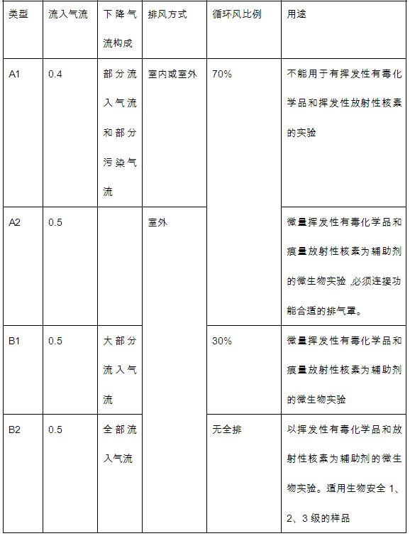 Ⅱ級安全柜按排放氣流占系統(tǒng)總流量的比例及內(nèi)部設(shè)計(jì)結(jié)構(gòu)分為A1、A2、B1、B2四種類型。