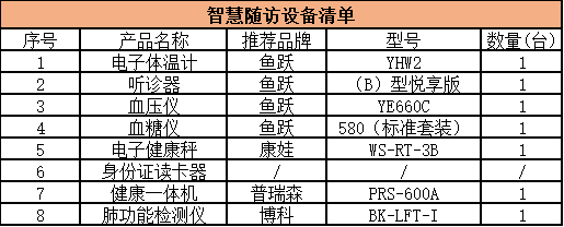 1.重點(diǎn)人群智慧隨訪設(shè)備:是指開展基本公共衛(wèi)生服務(wù)項(xiàng)目重點(diǎn)人群隨訪、可實(shí)現(xiàn)數(shù)據(jù)采集直接上傳的儀器設(shè)備,主要包括:血壓計(jì)、血糖儀、電子健康稱、身份證讀卡器、健康一體機(jī)等