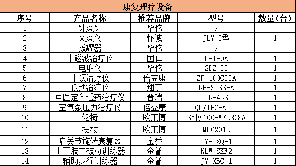 2.康復(fù)理療設(shè)備:是指利用人工或物理因素作用于人體實(shí)現(xiàn)預(yù)防和治療疾病的設(shè)施設(shè)備,主要包括各類針具、灸療設(shè)備、拔罐器具、電磁波治療儀、電麻儀、中低頻治療儀、肩關(guān)節(jié)旋轉(zhuǎn)訓(xùn)練器等。根據(jù)實(shí)際情況具體配備。