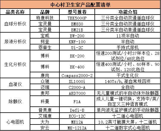 主要配備產(chǎn)品:血液分析儀、除顫儀、心電圖機(jī)(具備遠(yuǎn)程診斷功能)