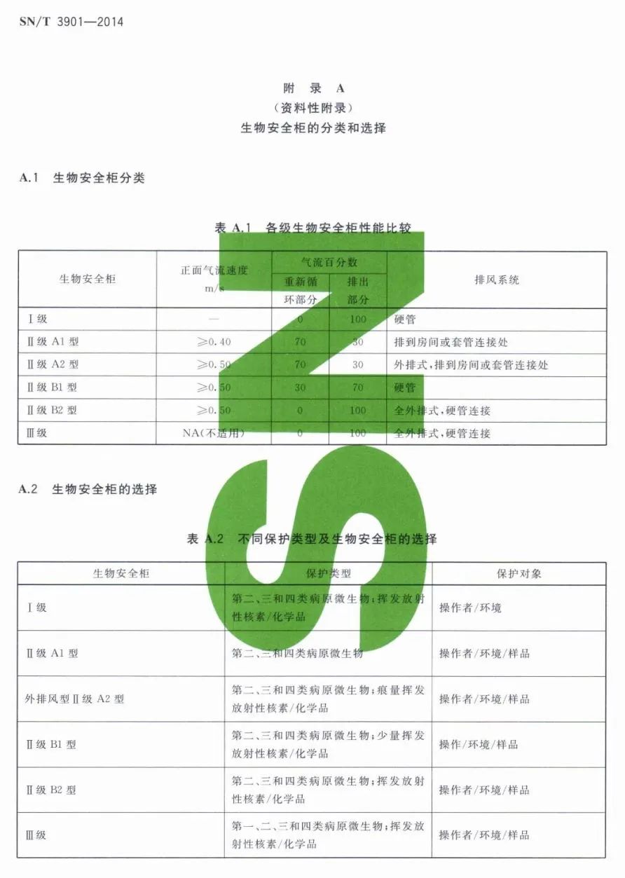 表A1《各級生物安全柜性能比較》,表A2《不同保護類型及生物安全柜的選擇》,具體請見下圖: