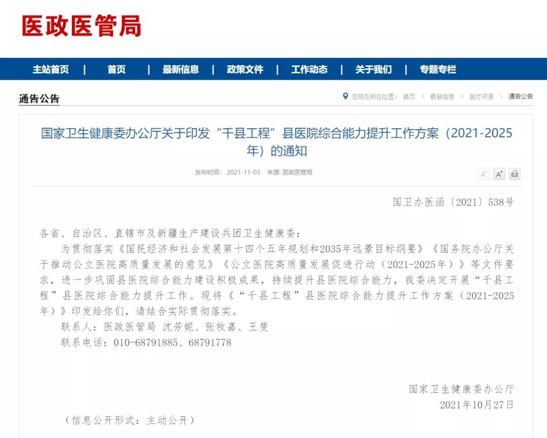 【更多】【權威發布】國家衛生健康委印發“千縣工程”縣醫院綜合能力提升工作方案