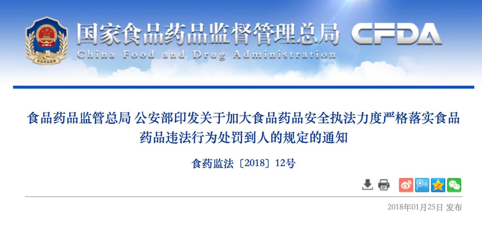 中華人民共和國國家食品藥品監(jiān)督管理總局(CFDA) 是國務院綜合監(jiān)督管理藥品、醫(yī)療器械、化妝品、保健食品和餐飲環(huán)節(jié)食品安全的直屬機構(gòu),負責起草食品(含食品添加劑、保健食品,下同)安全、藥品(含中藥、民族藥,下同)、醫(yī)療器械、化妝品監(jiān)督管理的法律法規(guī)草案