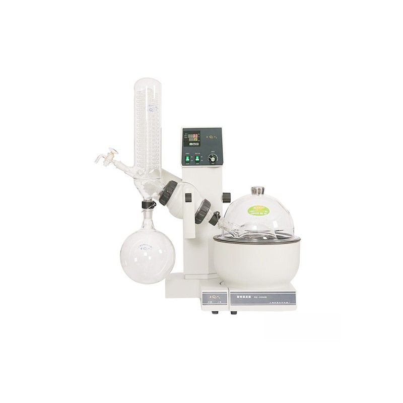旋轉蒸發器是在真空負壓條件下,利用恒溫加熱,薄膜蒸發的原理研制而成。旋轉蒸發器用無級調速使玻璃旋轉瓶恒速旋轉,物料在瓶壁形成大面積均勻薄膜,再由智能恒溫水浴鍋對旋轉瓶均勻加熱,在真空條件下高速蒸發,溶媒蒸氣經高效玻璃冷凝器冷卻,回收于收集瓶。