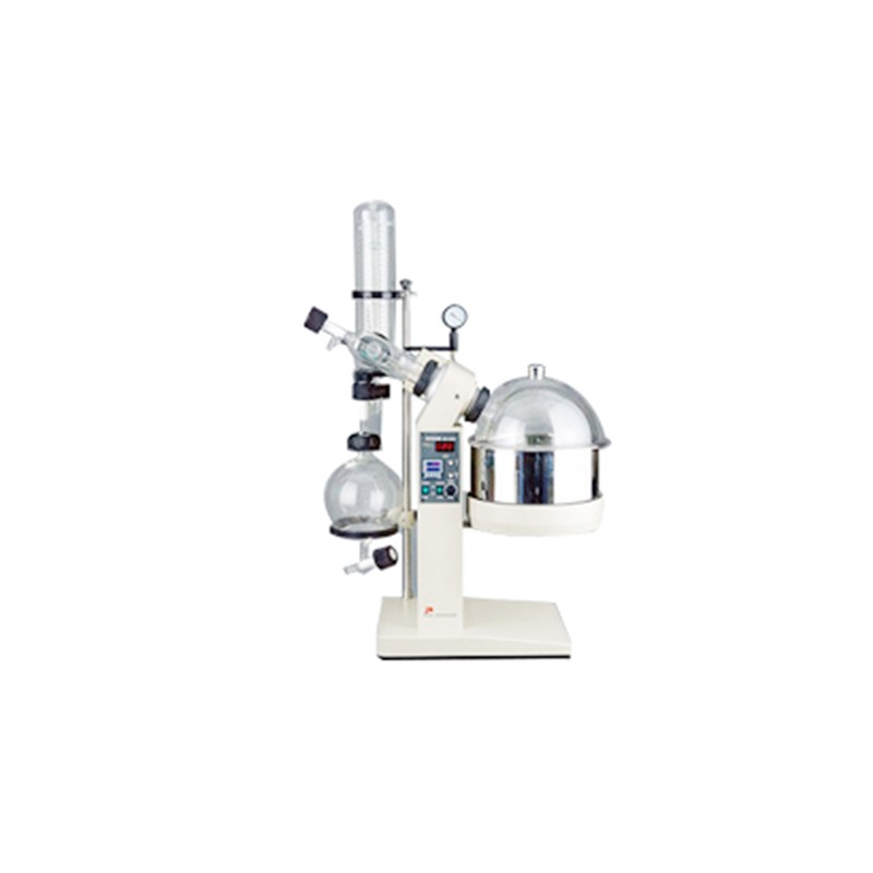 旋轉(zhuǎn)蒸發(fā)器是在真空負壓條件下,利用恒溫加熱,薄膜蒸發(fā)的原理研制而成。旋轉(zhuǎn)蒸發(fā)器用無級調(diào)速使玻璃旋轉(zhuǎn)瓶恒速旋轉(zhuǎn),物料在瓶壁形成大面積均勻薄膜,再由智能恒溫水浴鍋對旋轉(zhuǎn)瓶均勻加熱,在真空條件下高速蒸發(fā),溶媒蒸氣經(jīng)高效玻璃冷凝器冷卻,回收于收集瓶。